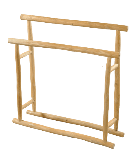 Freestanding wooden hanger made of Teak wood in a natural finish. Designed with a double rail, it offers practical space for hanging towels. Crafted from slender wood branches, it highlights the raw, organic character of the material, adding a natural aesthetic to the space.