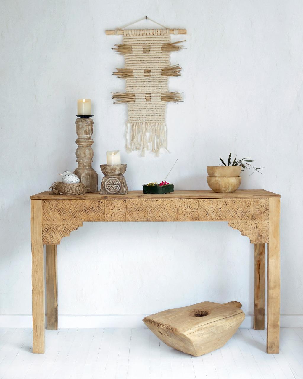 MUMBAI Console in Recycled Teak The MUMBAI console, crafted from recycled teak wood and featuring a carved front panel, is a distinctive and one-of-a-kind piece of furniture. It beautifully combines the history and character of aged wood with the exotic aesthetics of Indian motifs. The name “MUMBAI” evokes furniture inspired by India, where the art of wood carving has a long-standing tradition. The wood is sourced from old buildings, ships, or furniture, carrying with it the marks of time. This gives the console a unique rustic and vintage appearance, with nail holes, imperfections, and a natural patina. The carved front panel (the section above the drawers or legs) serves as the main decorative feature, inspired by traditional Indian patterns. This handcrafted detail makes each console truly unique and enhances its exotic character.