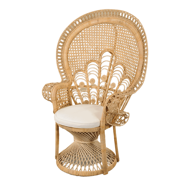 Peacock Natural Rattan Armchair with Cushion in Natural Finish The Peacock armchair is crafted from natural rattan in its original finish and comes with a comfortable cushion, offering a perfect blend of comfort, style, and organic aesthetics. Rattan armchairs provide natural warmth and elegance, bringing a sense of nature into any space while creating a relaxed and inviting atmosphere. They pair beautifully with natural fabrics such as linen and cotton and fit perfectly into minimalist, tropical/eco-chic, and boho interiors. Additionally, the use of natural rattan enhances the connection to nature, while its durability ensures long-lasting use with minimal maintenance.