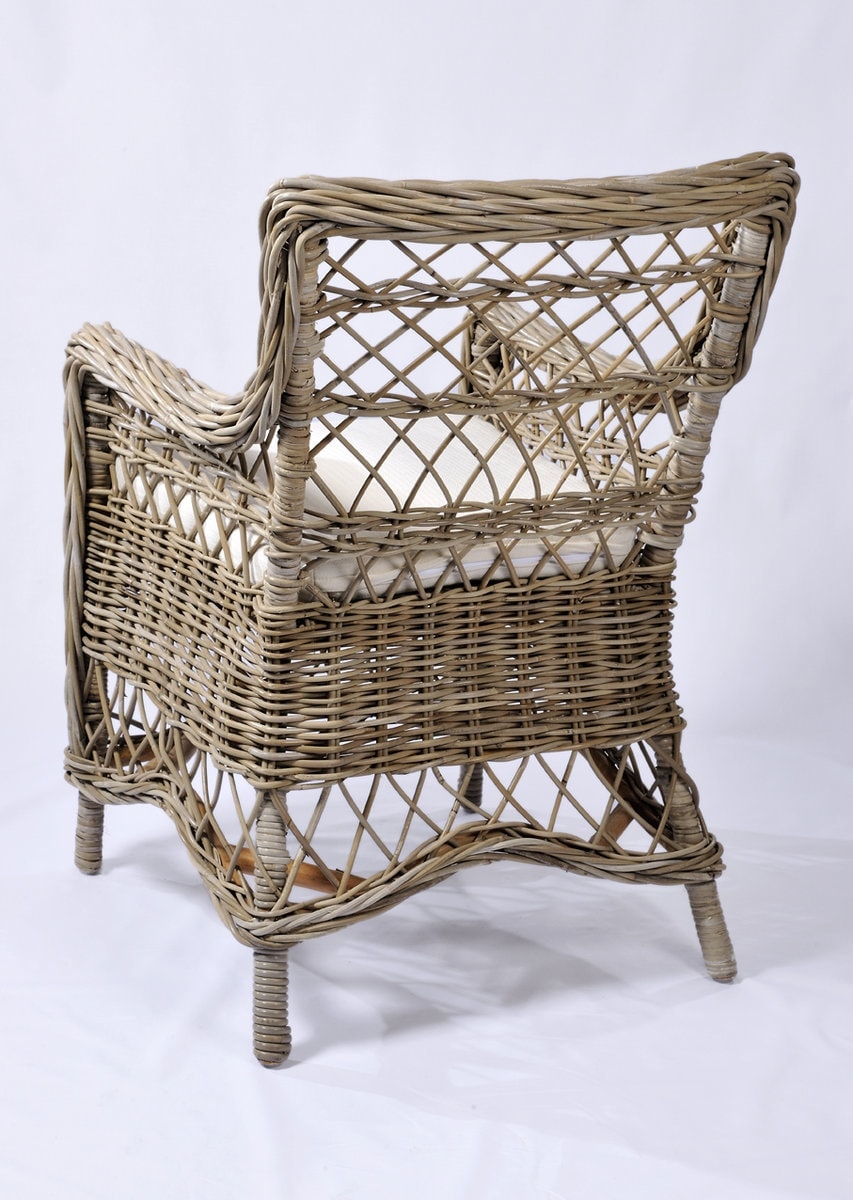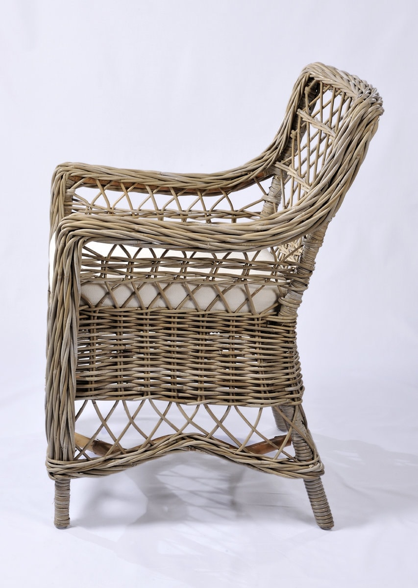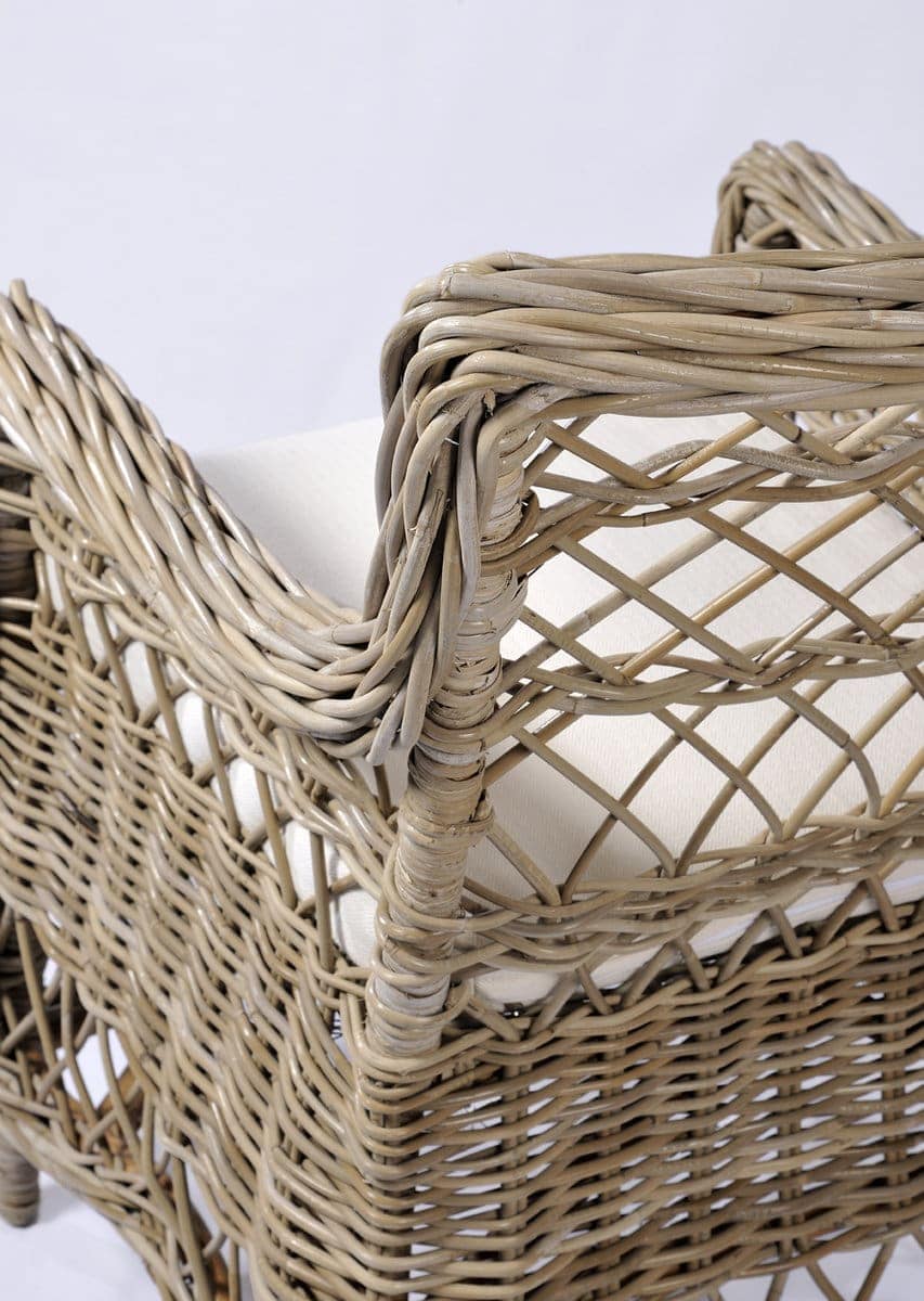 Πολυθρόνα ALEXANDER σε εκρού απόχρωση από φυσικό Rattan Kubu Grey με λευκό μαξιλάρι. Οι πολυθρόνες από rattan προσφέρουν φυσική ζεστασιά και κομψότητα, ενσωματώνοντας την αίσθηση της φύσης και δημιουργώντας χαλαρή ατμόσφαιρα. Συνδυάζονται άψογα με φυσικές υφές όπως λινό και βαμβάκι, ταιριάζουν σε μινιμαλιστικά, tropical/eco-chic και boho στυλ, και προσφέρουν ευελιξία καθώς χρησιμοποιούνται σε φωτιστικά, καρέκλες και τραπέζια. Επιπλέον, η χρήση φυσικού rattan επιτρέπει τη δημιουργία ενός συνεχούς δεσμού με τη φύση, ενώ η ανθεκτικότητα προσφέρει μακροχρόνια χρήση και λιγότερη συντήρηση.