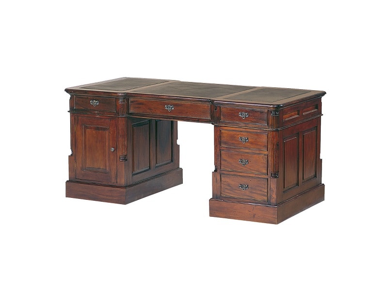 Handcrafted Colonial-style desk made of solid mahogany wood with a leather top, six drawers, and a cabinet. A handcrafted Colonial-style desk made of solid mahogany wood, featuring a leather top, six drawers, and a cabinet, is a piece of furniture with distinctive aesthetics and high value. Its characteristics are inspired by British colonial furniture, combining classic elegance with functionality. Mahogany is known for its durability and its rich reddish-brown color. It is ideal for handcrafted furniture, as it allows for detailed carving work. The leather top adds prestige and comfort to the desk. Colonial-style desks are recognized for their refined details, classic lines, and solid construction. It is a timeless piece, designed to last for years. The multiple drawers provide ample storage space for documents, books, and other items. The additional cabinet can be used for storing larger items, such as files, or for concealing cables. The spacious leather surface offers plenty of room for work, ensuring comfort. It can be used as a desk, a console table, or even as a decorative element, adding a touch of luxury to the space. This type of desk can be integrated into various interiors, such as: Classic décor: perfectly complements traditional aesthetics. Modern décor: creates an interesting contrast, adding character to the space. Bohemian décor: pairs beautifully with natural materials and textures.