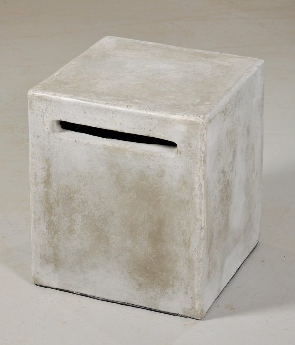 Βοηθητικό τραπεζάκι – σκαμπό από τσιμέντο σε γκρι χρώμα, με πλαϊνά ανοίγματα για να μεταφέρεται.