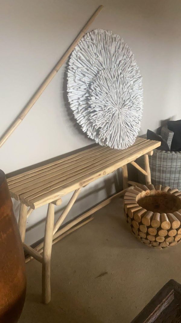 Kονσόλα από ξύλο Teak, διατίθεται σε φυσικό χρώμα και σε white wash. Μια κονσόλα από ξύλο Teak, που αποτελείται από μικρούς κορμούς ενωμένους συμμετρικά μεταξύ τους είναι ένα έπιπλο με ξεχωριστό, φυσικό και ρουστίκ χαρακτήρα. Αντί να χρησιμοποιεί μια ενιαία ρίζα, αυτή η κονσόλα δημιουργεί μια νέα, συμμετρική μορφή, διατηρώντας ωστόσο την πρωτόγονη υφή και ομορφιά του ξύλου. Το πρωτόγονο στυλ (“primitive”) τονίζει την φυσική, ανεπεξέργαστη ομορφιά του ξύλου, ενώ η συμμετρική ένωση των κορμών δημιουργεί μια ισορροπημένη και αρμονική εικόνα. Παρόλο που οι κορμοί είναι τοποθετημένοι συμμετρικά, κάθε κομμάτι είναι μοναδικό λόγω της φυσικής προέλευσης του ξύλου. Κάθε κορμός έχει διαφορετικά νερά και φυσικές ανωμαλίες. Μια τέτοια κονσόλα μπορεί να βρεθεί σε φυσικό χρώμα, για να αναδειχθεί η αυθεντική ομορφιά του ξύλου, αλλά και σε φινίρισμα “white wash” για ένα πιο ανάλαφρο, παραθαλάσσιο στυλ.