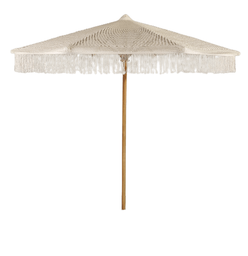 Ομπρέλα Macrame με σκελετό από ξύλο Teak. Μια ομπρέλα Macrame είναι ένα κομψό και ιδιαίτερο αντικείμενο, ιδανικό για να προσδώσει μια μποέμ και καλοκαιρινή ατμόσφαιρα σε εξωτερικούς χώρους, όπως η βεράντα, ο κήπος, η πισίνα ή η παραλία. Ο συνδυασμός του χειροποίητου μακραμέ και του ανθεκτικού ξύλου Teak δημιουργεί ένα αισθητικά μοναδικό αποτέλεσμα. Το Teak είναι ένα τροπικό ξύλο που φημίζεται για την αντοχή του στην υγρασία και τον χρόνο. Είναι στιβαρό και κατάλληλο για χρήση σε εξωτερικούς χώρους, προσφέροντας παράλληλα μια φυσική και πολυτελή εμφάνιση. Το μακραμέ είναι μια τεχνική πλέξης με σχοινί, που δημιουργεί περίτεχνα σχέδια. Στις ομπρέλες, χρησιμοποιείται για τη δημιουργία ενός μοναδικού, διακοσμητικού καλύμματος, συχνά σε εκρού ή μπεζ αποχρώσεις, με κρόσσια στις άκρες. Η ομπρέλα αυτή είναι το κατεξοχήν έπιπλο για τη δημιουργία ενός μποέμ ή τροπικού στυλ διακόσμησης. Ταιριάζει απόλυτα σε χώρους με φυσικά υλικά και χαλαρή διάθεση.