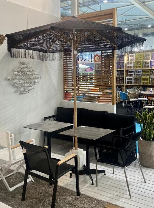 Ομπρέλα με μαύρο Macrame και σκελετό από ξύλο Teak. Μια ομπρέλα με μαύρο μακραμέ, είναι ένα εντυπωσιακό και στυλάτο κομμάτι, που συνδυάζει την ανθεκτικότητα και την κομψότητα του ξύλου με την ιδιαίτερη αισθητική του χειροποίητου μακραμέ. Αυτός ο συνδυασμός είναι ιδανικός για να δημιουργήσει μια πολυτελή, μποέμ ατμόσφαιρα σε εξωτερικούς χώρους. Ο σκελετός από ξύλο Teak προσφέρει μεγάλη αντοχή στον χρόνο και στις καιρικές συνθήκες. Το σκίαστρο από μαύρο μακραμέ, συνήθως από βαμβακερό σχοινί, δημιουργεί ένα μοναδικό οπτικό αποτέλεσμα. Η μαύρη απόχρωση δίνει έναν πιο σύγχρονο και κομψό τόνο, σε αντίθεση με τα πιο συνηθισμένα, ανοιχτόχρωμα μακραμέ. Το μαύρο μακραμέ σε συνδυασμό με το φυσικό ξύλο Teak δημιουργεί μια ενδιαφέρουσα αντίθεση, κατάλληλη για πιο ιδιαίτερες διακοσμήσεις. Μπορεί να ενταχθεί σε στυλ διακόσμησης όπως το Boho Chic, το Tropical, ακόμα και σε πιο Minimal περιβάλλοντα, όπου θα λειτουργήσει ως statement κομμάτι. Είναι ιδανική για κήπους, βεράντες, πισίνες, παραλίες, αλλά και για επαγγελματικούς χώρους, όπως beach bars ή ξενοδοχεία.